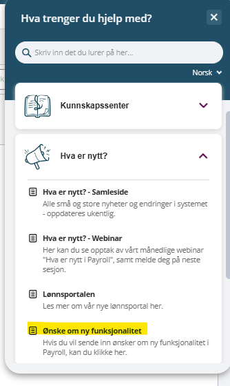 Minner om at du selv kan finne denne informasjonen inne i payroll. Her kan du oppdatere deg på hva som er nytt, både via webinarer og innlegg. Og det lønner seg å ta en tur innom i ny og ne. Om det er noe du savner eller om du har forslag til bedring kan man også sende inn ønsker.