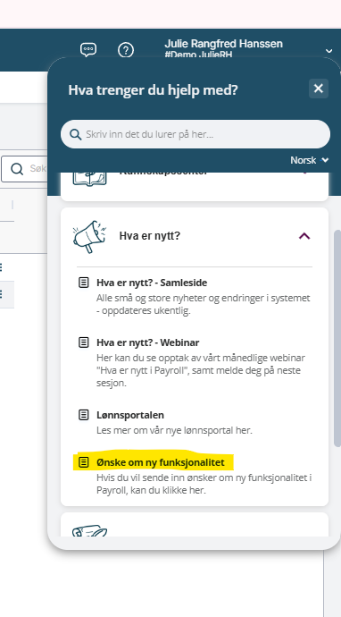 Savner du mer crisp ? Eller mer ingredienser i produktene ? Husk at du alltid kan sende inn ønsker om ny fuksjonalitet inne i payroll. Trykk på spørsmålstegnet øverst på høyre side, velg "hva er nytt" og scroll ned.