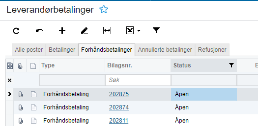 Hvis det har samlet seg opp mange åpne forhåndsbetalinger, kan disse ryddes opp ved å gå til leverandørbetalinger under leverandørreskontroen. Her vil du finne en egen fane for forhåndsbetalinger, og ved å filtrere på statuskolonnen kan du se kun de forhåndsbetalingene som ennå ikke er matchet mot en faktura.