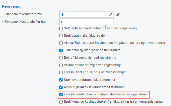 Men den beste løsningen er å behandle forhåndsbetalinger løpende når fakturaene bokføres. Denne muligheten må aktiveres under leverandørinnstillingene. Knappen for dette heter "Foreslå kreditnotaer og forhåndsbetalinger før oppdatering".