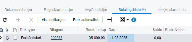 Når dette er aktivert, vil du ha muligheten til å matche forhåndsbetalinger og kreditnotaer direkte på fakturaen før den bokføres. Dette forenkler vedlikeholdet av en ryddig leverandørreskontro betydelig, og reduserer samtidig sannsynligheten for at fakturaer blir dobbeltbetalt. Du finner valgene mellom forhåndsbetalinger og kreditnotaer på fakturaen under betalingshistorikk.